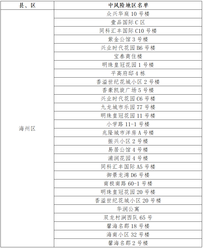 根據(jù)國務院聯(lián)防聯(lián)控機制有關規(guī)定,經(jīng)市指揮部研究決定,自發(fā)布之日起,對我市部分區(qū)域疫情風險等級進行調(diào)整:海州區(qū)天順國際花園7號樓、鳳凰名都10號樓、御景龍灣C1號樓、天順國際花園11號樓、御景龍灣A4號樓、香溢江南小區(qū)12號樓、同科匯豐國際A2號樓、平高書香名邸1號樓、香溢江南小區(qū)7號樓、西門村楊鳳莊21號、鳳凰名都9號樓、園林村白虎山小區(qū)78號樓、江化北路82-5號、金色大漠、平高書香名邸4號樓、朐陽街道花園路1號、制藥巷5-114、萬潤泰和苑4號樓由中風險地區(qū)調(diào)整為低風險地區(qū)。其他地區(qū)風險等級不變。調(diào)整后全市現(xiàn)有28個中風險地區(qū)。