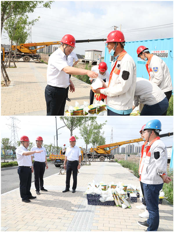 7月28日上午,集團(tuán)公司黨委副書記戴鴻鳴、工會(huì)主席劉承志一行,深入公司施工一線走訪慰問職工,把綠豆、牛奶等防暑降溫用品送到他們手中,在炎炎夏日,為一線職工送去集團(tuán)公司的深切關(guān)懷。 在臺(tái)北工地,戴書記與施工人員親切交談,簡要了解了工程的施工情況,叮囑他們?cè)谙娜崭邷仄陂g要注意安全,做好防暑降溫措施,確保安全生產(chǎn)和身體健康。(電宣)