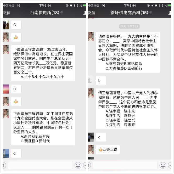 本次考試采用微信答題的方式,由黨群人員先在微信群里清點(diǎn)黨員人數(shù),隨后每人回答指定問(wèn)題,確保測(cè)試范圍覆蓋全體黨員。微信考試的方式,解決了黨員學(xué)習(xí)時(shí)間上、空間上的難題,具有很大的便利性和可操作性。(電宣)