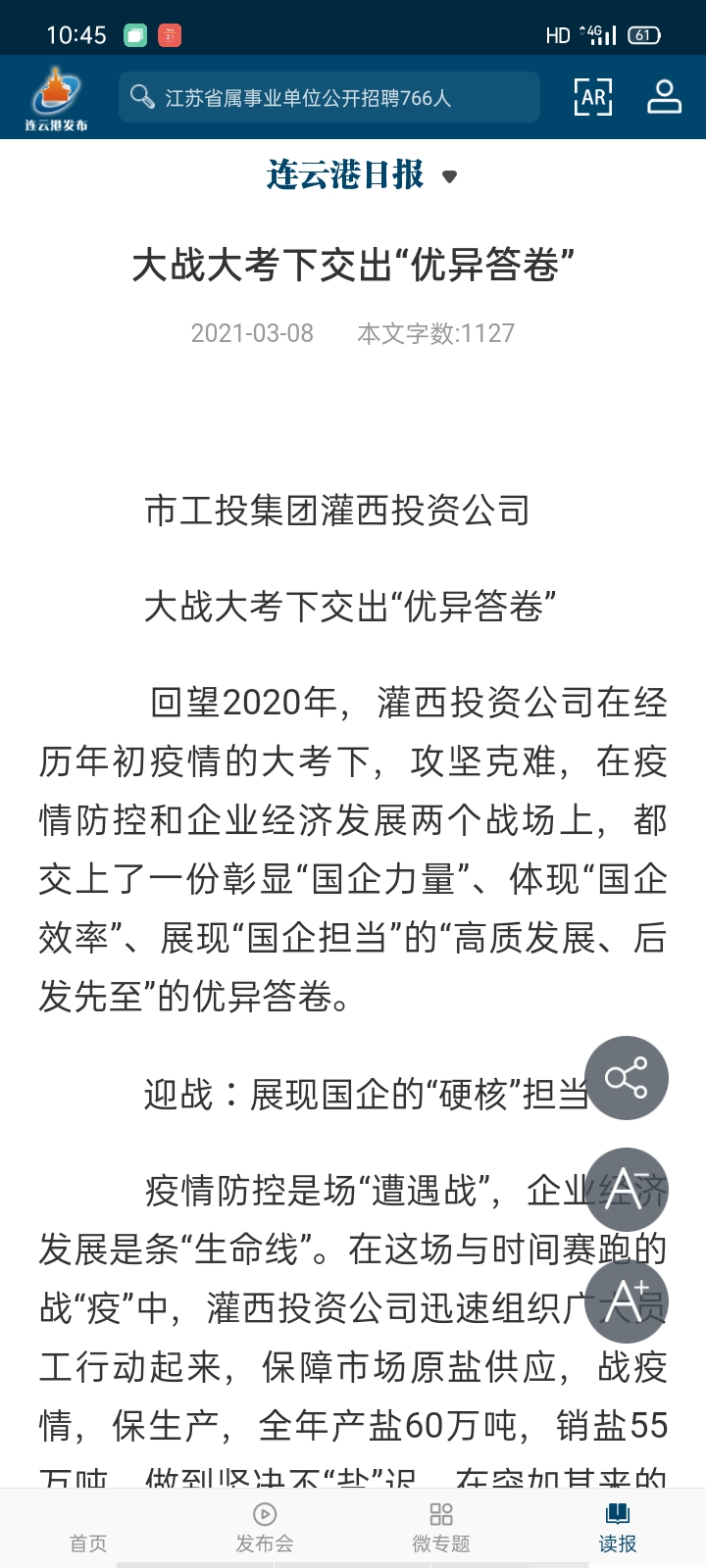 嚴(yán)冬之后就是暖春,疫情之后就是百花齊放、花香滿園。在疫情得到有力有效控制并做好常態(tài)化疫情防控的前提下,灌西踩足復(fù)工復(fù)產(chǎn)“大油門”、按下經(jīng)濟(jì)發(fā)展“快進(jìn)鍵”,先后對到期1萬余畝農(nóng)田、5千余畝養(yǎng)殖池塘對外公開租賃,實(shí)現(xiàn)資源創(chuàng)效8千萬元。硬仗,一場接著一場,也因疫情讓灌西五灌河碼頭運(yùn)輸一度的停產(chǎn),在克服疫情造成的不利影響,依托徐圩、燕尾產(chǎn)業(yè)區(qū)內(nèi)大型企業(yè),承接化工噸袋、鋼材、管樁、碳素等轉(zhuǎn)運(yùn)業(yè)務(wù),全年碼頭吞吐量超110萬噸。經(jīng)濟(jì)發(fā)展勢頭不減,民生福祉標(biāo)準(zhǔn)不降。去年,圍繞新時(shí)代產(chǎn)業(yè)工人隊(duì)伍改革出臺以“點(diǎn)、線、面、體”的灌西產(chǎn)改12條舉措得到有效落實(shí),其中“一星三制”產(chǎn)改工作機(jī)制被市總工會(huì)在全市推廣,職工收入增幅達(dá)12%。