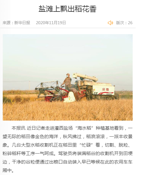近日記者走進灌西鹽場“海水稻”種植基地看到,一望無際的稻田像金色的海洋,秋風(fēng)拂過,稻浪滾滾,一派豐收景象。幾臺大型水稻收割機正在稻田里“忙碌”著,切割、脫粒、粉碎稻稈等工序一氣呵成。駕駛員將裝滿稻谷的收割機開到田埂邊,干凈的谷粒便通過出糧口自動裝入早已等候在此的農(nóng)用車車廂中。