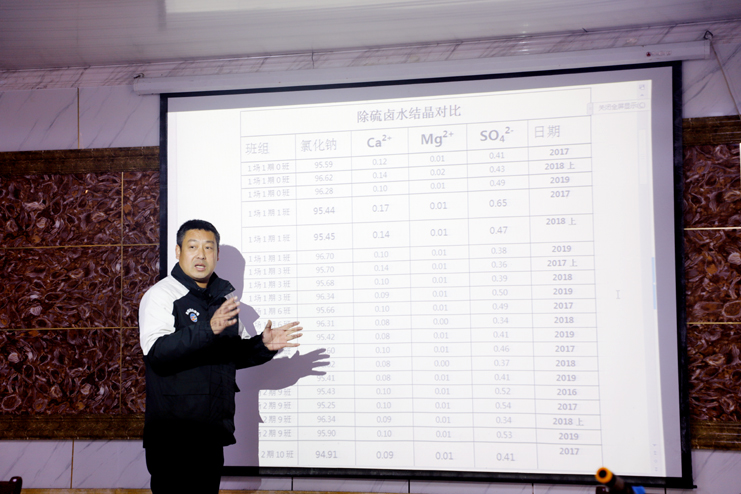 為進一步提高日曬制鹽公司原鹽生產(chǎn)質(zhì)量,通過一年來的新鹵與老鹵長鹽數(shù)據(jù)對比,使用全新鹵水長鹽氯化鈉含量明顯提高,硫酸根離子、鈣離子也有所下降,使得分區(qū)曬鹽提高鹽質(zhì)提供了數(shù)據(jù)依據(jù)。此次培訓(xùn),深入講解了分區(qū)供鹵、老鹵區(qū)分、混合鹵水的分池結(jié)晶實施辦法以及在雨天收集淋板水,提高利用窮制鹵的途徑。培訓(xùn)中,圍繞礦鹵日曬制鹽技術(shù)及除硫工藝兩個方面,重點對鹽質(zhì)的管控、除硫的目的、意義、工藝流程等方面內(nèi)容進行了講解,使參訓(xùn)人員特別是一線班組長對鹽質(zhì)和除硫工作的重要性有了更深刻的認(rèn)識,同時也為鹽質(zhì)鹽量的提升奠定了理論基礎(chǔ)。(張明建)