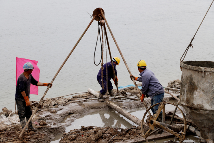 5月30日下午,藍(lán)色的天空沒(méi)有一絲云彩,火熱的太陽(yáng)炙烤著大地。在灌西投資公司五灌河碼頭擴(kuò)建項(xiàng)目建設(shè)工地,施工人員正在各司其職的工作著,有的在使用電鋸,有的在壓鋼筋,還有的在焊接鋼筋框架。遠(yuǎn)處一臺(tái)混凝土澆灌機(jī)在進(jìn)行混凝土澆灌作業(yè),碼頭岸邊大小打樁機(jī)器一字排開(kāi),筆者親身感受五灌河碼頭二期工地開(kāi)發(fā)建設(shè)的火熱場(chǎng)面。