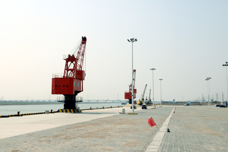在五灌河碼頭現(xiàn)場(chǎng),302米長(zhǎng)的碼頭平臺(tái)上,2座20多米高的紅色座吊一字排開(kāi),在河水的映照下顯得格外“威武”。據(jù)碼頭工作人員介紹,這兩座吊機(jī)剛剛安裝并調(diào)試完畢,它們是五灌河碼頭運(yùn)營(yíng)的最基本條件之一,一座25噸,另一座40噸,運(yùn)出貨物將通過(guò)這兩座吊機(jī)完成。
