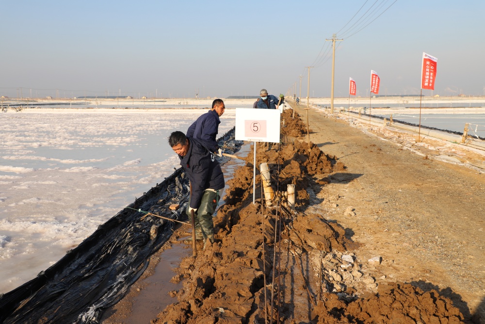 寒冬時節(jié),暖陽之下,鹽廩之旁,曬得黝黑的鹽場產(chǎn)業(yè)工人們按照競賽的考核標(biāo)準(zhǔn),做熟泥、打堰墻、做堰頂,護埝頂、夯埝坡、清塘底,見證了一場技能比拼的盛會。經(jīng)過一天的鏖戰(zhàn),潘成軍師徒取得了池堰修整第一名;董治波師徒取得了土塘清淤第一名。(西工)