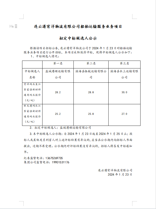 連云港宵洋物流有限公司船舶運輸服務(wù)業(yè)務(wù)項目擬定中標候選人公示