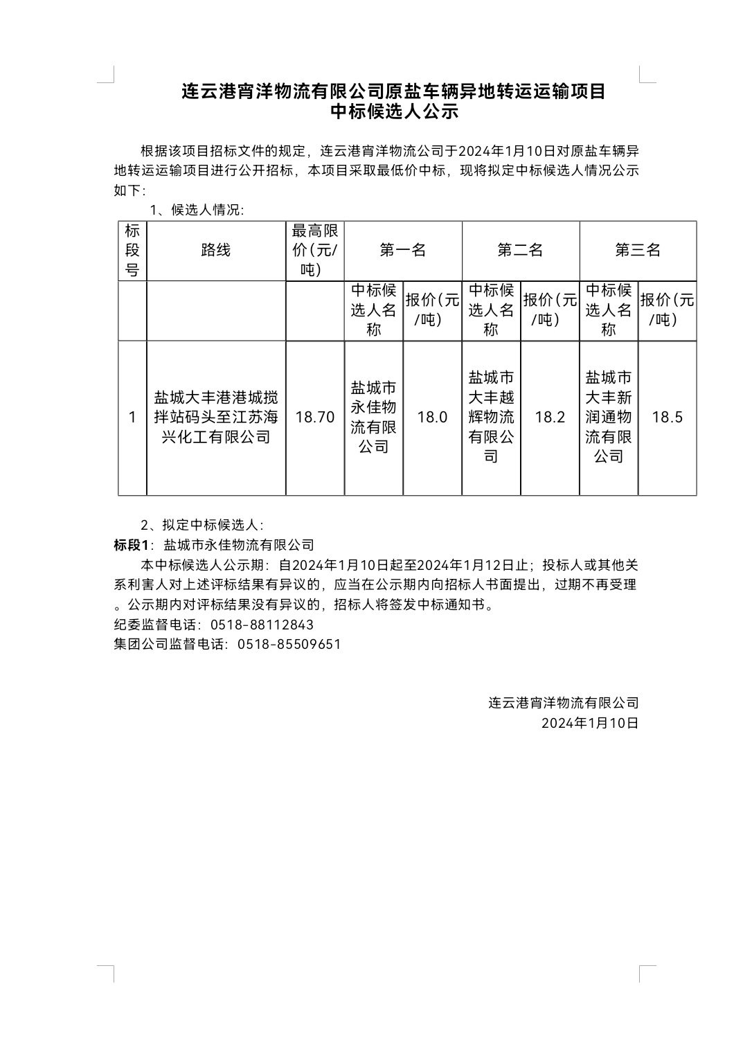連云港宵洋物流有限公司原鹽車輛異地轉(zhuǎn)運運輸項目中標候選人公示