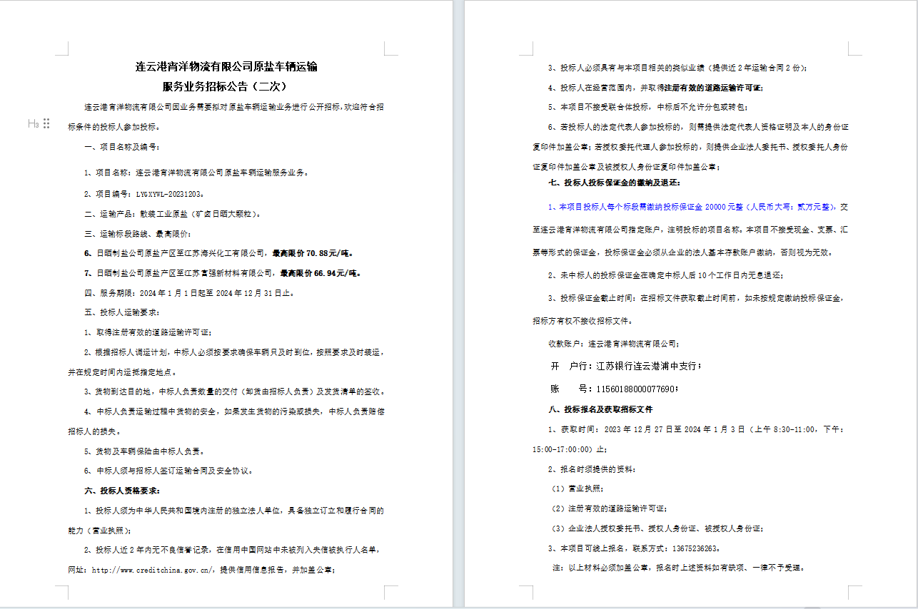連云港宵洋物流有限公司原鹽車輛運輸服務(wù)業(yè)務(wù)招標公告(二次)