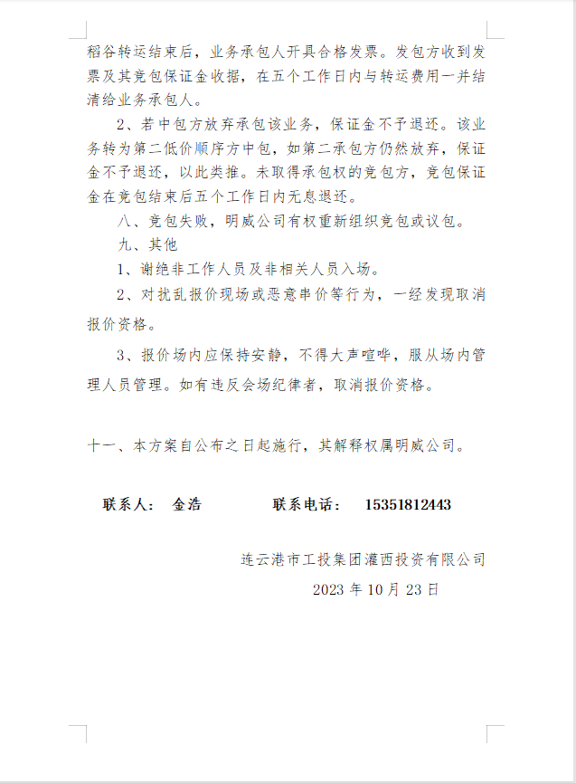 2023年秋收稻谷轉(zhuǎn)運業(yè)務(wù)發(fā)包公告