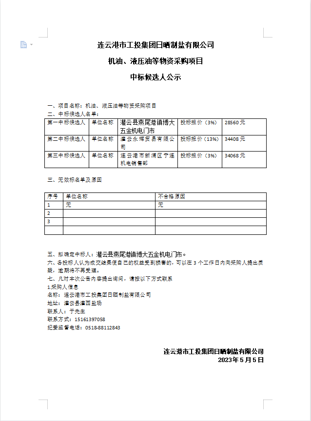 連云港市工投集團(tuán)日曬制鹽有限公司機(jī)油、液壓油等物資采購項目中標(biāo)候選人公示