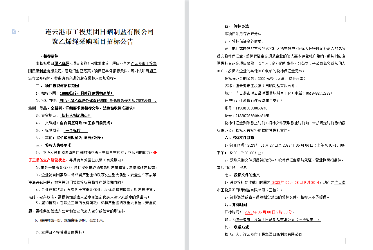連云港市工投集團(tuán)日曬制鹽有限公司聚乙烯繩采購項目招標(biāo)公告