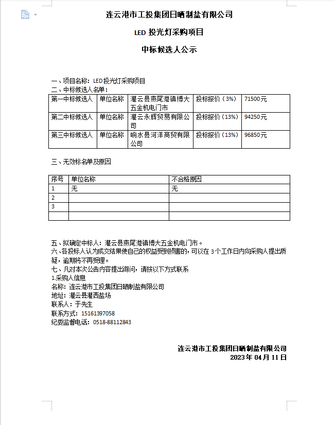 連云港市工投集團(tuán)日曬制鹽有限公司LED投光燈采購(gòu)項(xiàng)目中標(biāo)候選人公示