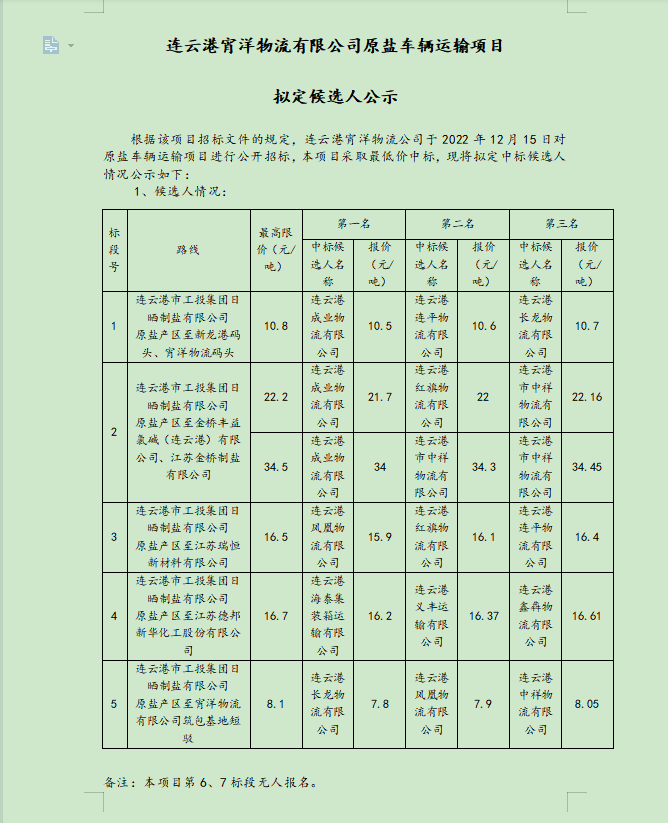 連云港宵洋物流有限公司原鹽車(chē)輛運(yùn)輸項(xiàng)目擬定候選人公示
