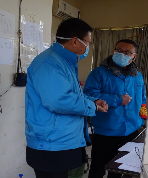 李忠祥檢查門衛(wèi)進場人員測體溫情況(左一)