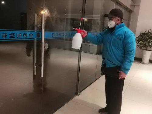 孫正柱為辦公樓入口進行消毒