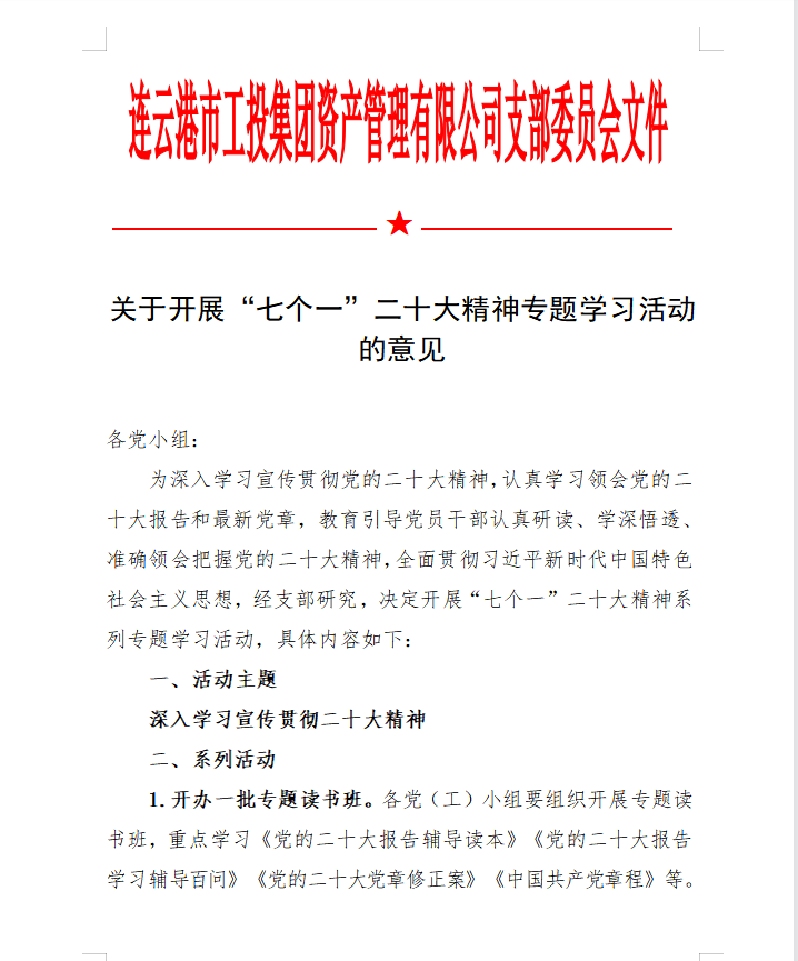 為在金融板塊快速掀起學(xué)習(xí)宣貫黨的二十大精神熱潮,支部精心組織、積極籌劃,完善學(xué)習(xí)方案,創(chuàng)新學(xué)習(xí)教育形式,豐富黨建活動(dòng)載體,支部結(jié)合公司實(shí)際,專門制定《學(xué)習(xí)宣傳貫徹二十大精神學(xué)習(xí)方案》、《關(guān)于開展“七個(gè)一”二十大精神專題學(xué)習(xí)活動(dòng)的意見》。