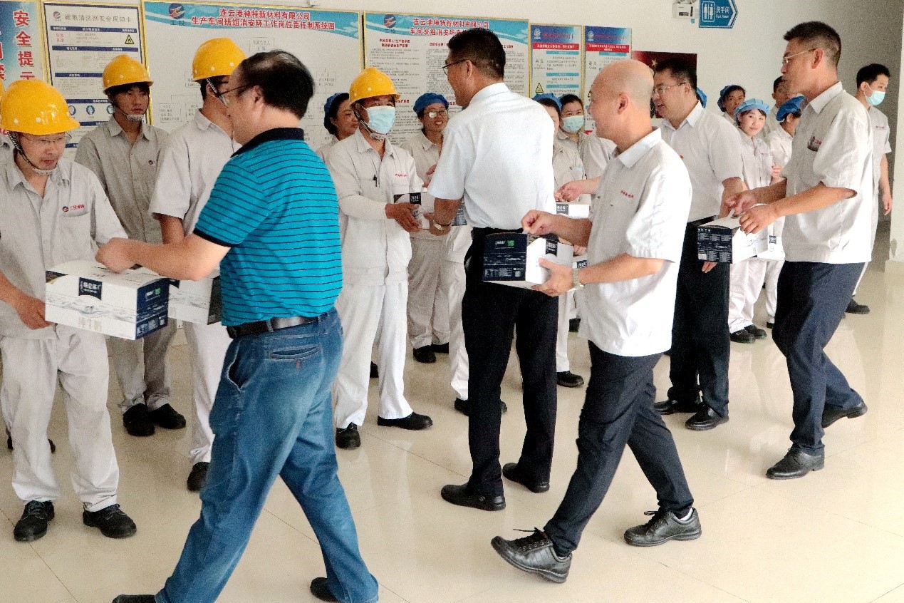 728日上午,集團公司黨委副書記戴鴻鳴、工會主席劉承志一行到公司慰問生產(chǎn)一線員工,為生產(chǎn)一線員工送來牛奶、綠豆、白糖、大米等防暑降溫慰問品。公司董事長張斌、總經(jīng)理韓立新等領(lǐng)導陪同。
