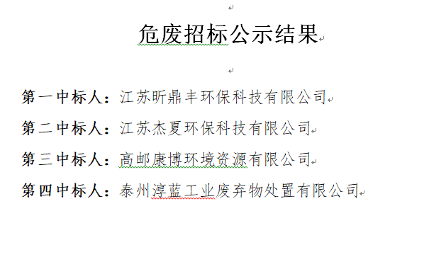 危廢招標(biāo)公示結(jié)果