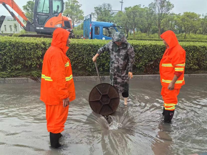 盛達(dá)市政分公司支委在“責(zé)任區(qū)”一線指揮,黨員沖鋒在前,24小時(shí)不間斷,在防汛一線筑牢“紅色城墻”,全力守護(hù)人民群眾生命財(cái)產(chǎn)安全。前后出動(dòng)車輛設(shè)備10余輛,處理道路積水20余處,應(yīng)急開放閘9次,處理12345平臺(tái)案件100余件,應(yīng)急打開圍堰4處,24小時(shí)監(jiān)護(hù)新光和花果山涵洞,緊急處理公交站臺(tái)、交通標(biāo)志牌等城市家具傾倒7處;翔立分公司多次緊急“處警”,快速修復(fù)開太閘電路等多處電力故障,保障開發(fā)區(qū)泄洪秩序。