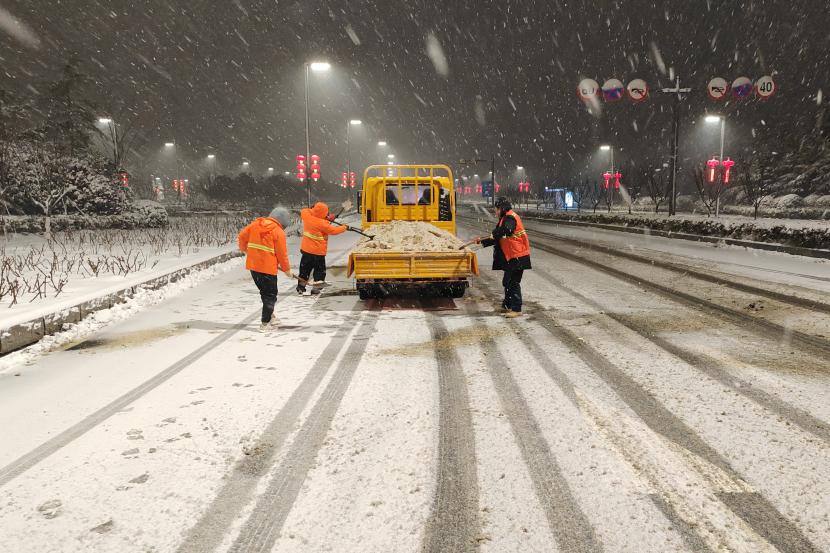 深夜時分,該公司負責人趙陽、副經(jīng)理孫振剛等領導班子成員及管理人員,帶領徐育華、王永等數(shù)名工人,對花果山大道及轄區(qū)易積雪區(qū)域和橋梁陡坡處、事故多發(fā)處開展清雪除冰工作。盡管刮著寒風,飄著雪花,大風肆虐如刀割似的吹拂著臉頰,雪花染白了頭發(fā)、浸濕了衣袖、凍紅了臉龐,可身著橘色工作服的趙陽一行,面對這一難啃的骨頭,卻絲毫沒有懈怠,他們發(fā)揚螞蟻啃骨頭的精神,冒著嚴寒一直與冰雪搏斗。副經(jīng)理朱文江開著工具車慢慢前行,趙陽、孫振剛等人緊跟其后,一锨一锨奮力撒融雪劑,徐育華、王永等人則一點一點鏟除地面積雪,現(xiàn)場人員爭先恐后,配合默契,經(jīng)過一夜的連續(xù)作戰(zhàn),隨著太陽的升起,終于將公路上的“白色巨龍”降伏。在寒晨的冬陽下,他們拖著疲憊的身子離開清雪除冰現(xiàn)場,那身橘色的工作服猶如不滅的火炬,融化了冰雪,溫暖了行人。