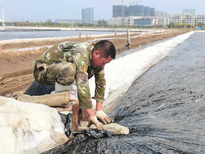 礦鹽班組根據(jù)天氣狀況做好雨前塑布苫蓋工作,確保勞動成果不受暴雨影響,最大化實現(xiàn)年產(chǎn)量,并利用扒鹽停機(jī)間隙做好灘地基礎(chǔ)工作,維護(hù)輸鹽管道及集鹽機(jī),以便于扒鹽開機(jī)高效率運轉(zhuǎn)。