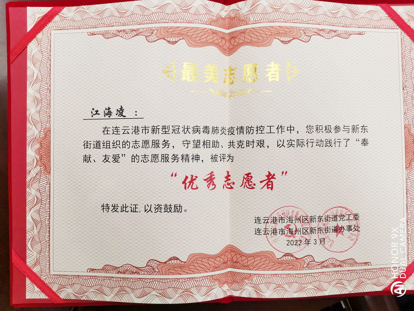 近日,港城成功戰(zhàn)勝新冠肺炎疫情,全市“摘星”轉(zhuǎn)為低風(fēng)險(xiǎn)地區(qū)。疫情發(fā)生以來一直奮戰(zhàn)在社區(qū)抗疫一線的黨員也收獲一份喜悅,紛紛被所服務(wù)街道、社區(qū)評為“最美志愿者”等榮譽(yù)稱號,江海凌就是其中優(yōu)秀代表之一。