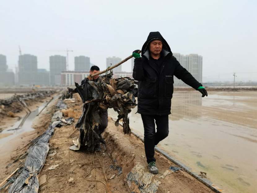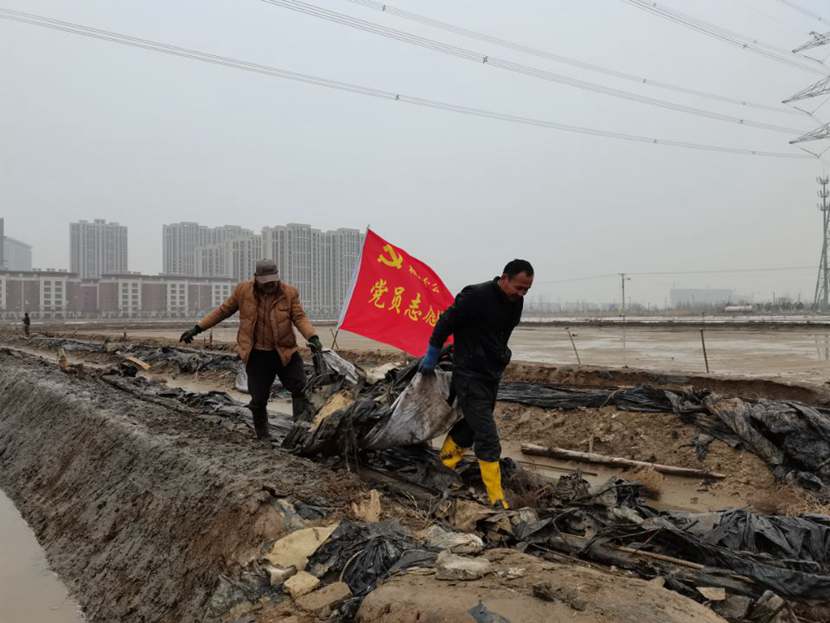 1月10日下午,第一批馳援隊(duì)伍——翔立分公司黨員突擊隊(duì)到達(dá)先鋒班組,結(jié)合海州灣公司黨員突擊隊(duì)共30余名隊(duì)員,穿戴好工作服、水鞋,兩人一組,三人一隊(duì),雙肩挑,三人抬,緊張有序地清理生產(chǎn)現(xiàn)場拆除下來的廢棄的塑布、鋼絲等雜物。