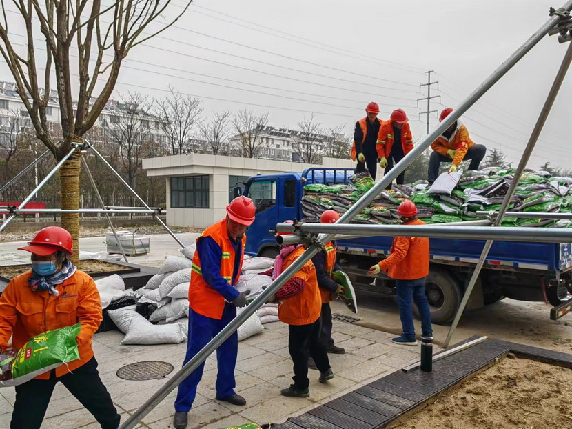納?;ň趁娣e為126㎡,施工周期27日至31日,共5天。此次栽植前工作不同于以往,要先在底部鋪設(shè)排水板、土工布及2cm厚陶粒墊層,保證花箱底部透氣性及在降雨時能及時排出積水,再鋪設(shè)25cm厚黑泥土加20cm厚營養(yǎng)土拌5%沙,滿足植物的生長需要,完成栽植后在土壤上層鋪設(shè)2cm厚麥飯石。