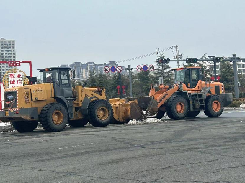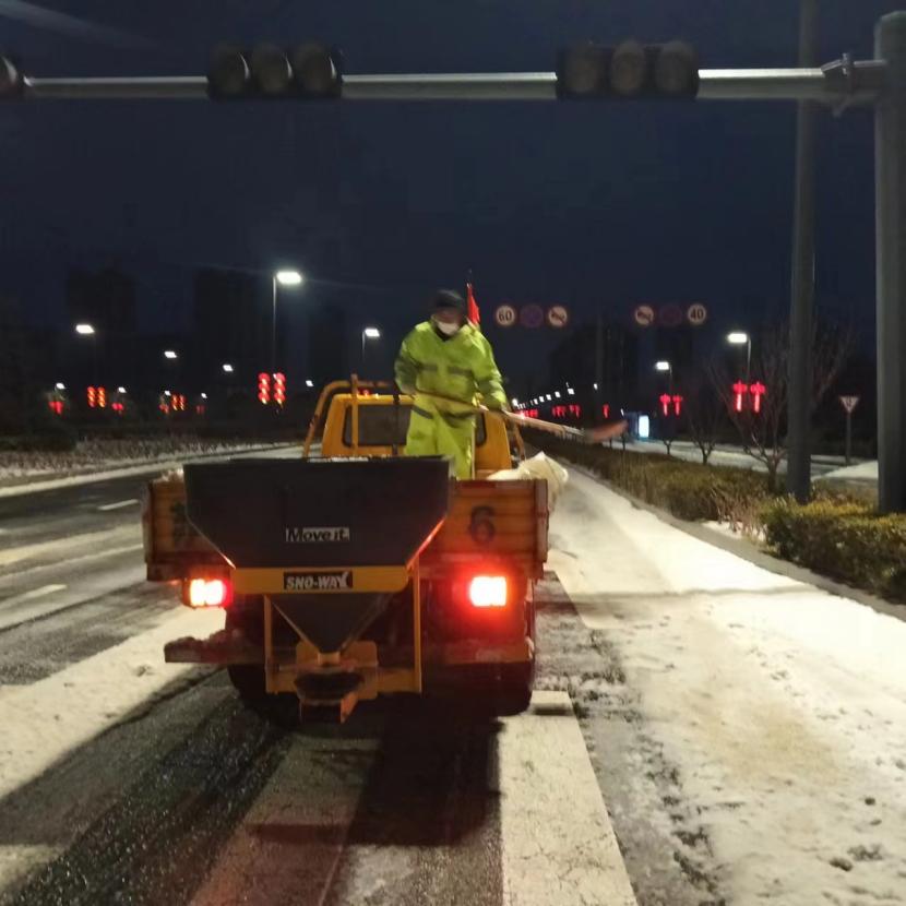 ? ? 一方有難,八方支援。由于本次降雪量大、勢(shì)急、持久,單靠環(huán)衛(wèi)分公司無(wú)法全面完成任務(wù),在上級(jí)領(lǐng)導(dǎo)的統(tǒng)籌考慮下,兄弟單位火速馳援,大綠化、大市政、大采購(gòu),大的不僅是業(yè)務(wù)整合,更是人心凝聚,更是集思廣益。翔立、盛達(dá)利用鈣液和工程資源優(yōu)勢(shì),通過架設(shè)大型原料桶儲(chǔ)備鈣液水,由3-5輛工具車進(jìn)行24小時(shí)鈣液拋灑,積冰融化速度超出預(yù)期,提升了后期鏟車的工作效率,順利保證了上下班高峰期交通順暢。特別是在2月22日,在兄弟單位的協(xié)助下在清晨8點(diǎn)完成了活動(dòng)路線保障及市領(lǐng)導(dǎo)掃雪除冰視察。