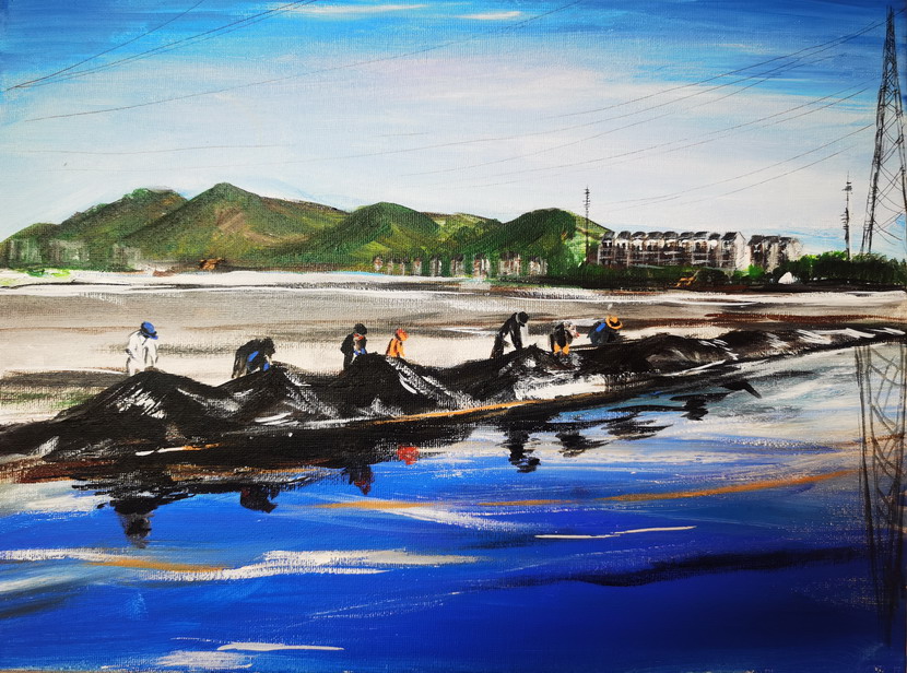 在這個屬于黨員的節(jié)日,我們脫下華麗的衣裳,全副裝備到達東灘,男同事們穿上水靴拿起鐵锨下到溝里,溝里淤泥已經漫過了腿肚,女同事三五成群撿垃圾,抬浮板……背灼炎天光,力盡不知熱,在火熱的太陽下,我們頂著一身如雨的汗水,只為能在熱火朝天的奮斗中,給彼此一份清涼的懷念。